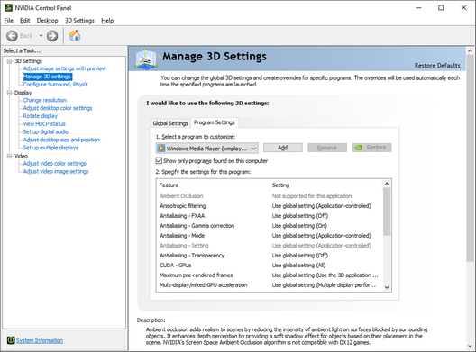 ▪ In Windows 10, go to the desktop> right-click> NVIDIA control panel> 3D settings> manage 3D settings> program settings> 1. select the program to customize> add> select MADRIX 5> click add, select program> 2. Select the preferred graphics processor for the program:> select a high-performance processor> click apply.